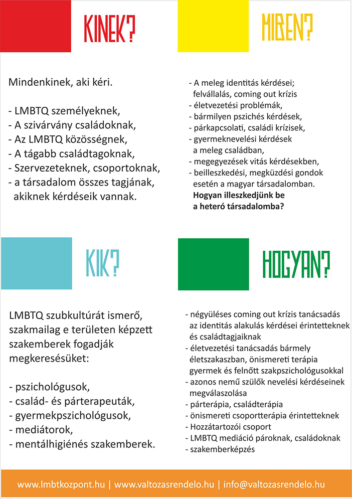 - A szervezetek képviselői egyet értenek abban, hogy a népszerűsítés első lépése a megismertetés, hiszen az LMBT emberek nem ismerik, hogy van ilyen lehetőség