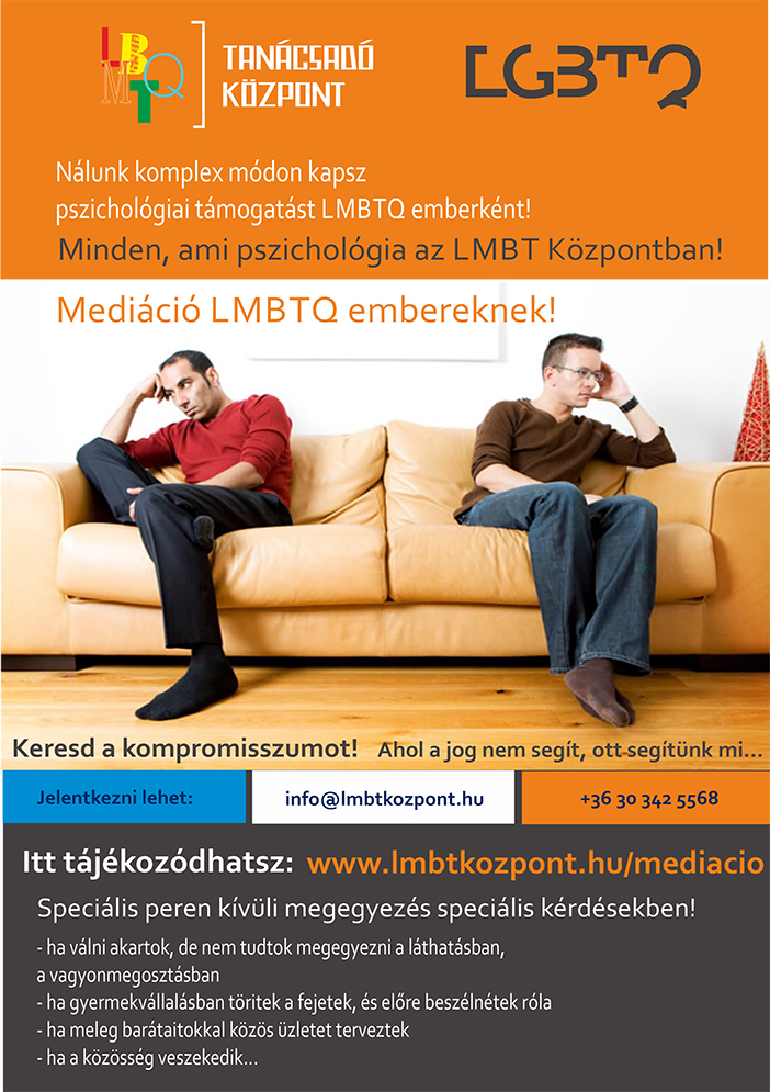 Ennek keretében tartunk egy egésznapos szakmai workshop-ot mediátorok-, illetve a szakma iránt érdeklődők számára, az LMBTQ mediáció sajátosságait illetve hazai és nemzetközi tapasztalatainkat ismertetve, azzal a céllal, hogy közösen gondolkodva kialakuljon egy értékes szakmai eszmecsere.