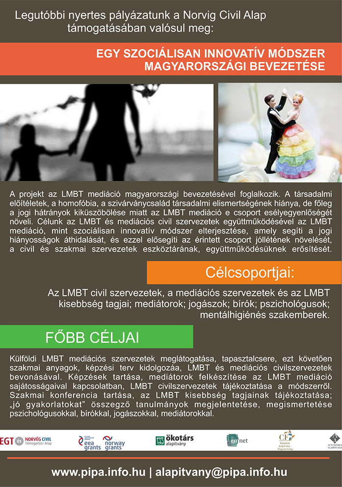 Ahogy azt már többen tudják, az LMBTQ központ és a Változás rendelő munkáját segítő PIPA Alapítvány keretében az LMBTQ mediáció magyarországi gyakorlati bevezetésére elnyertünk egy NCTA-2015-11001-F pályázati számú Norvég pályázatot.